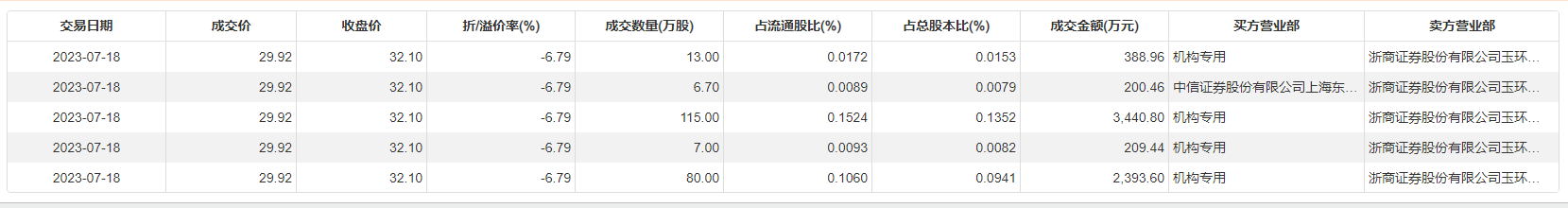 7月18日大宗交易成交355.4万股,成交额1.06亿元,占当日总成交额的7.15%,成交价29.92元,较市场收盘价折价6.79%。