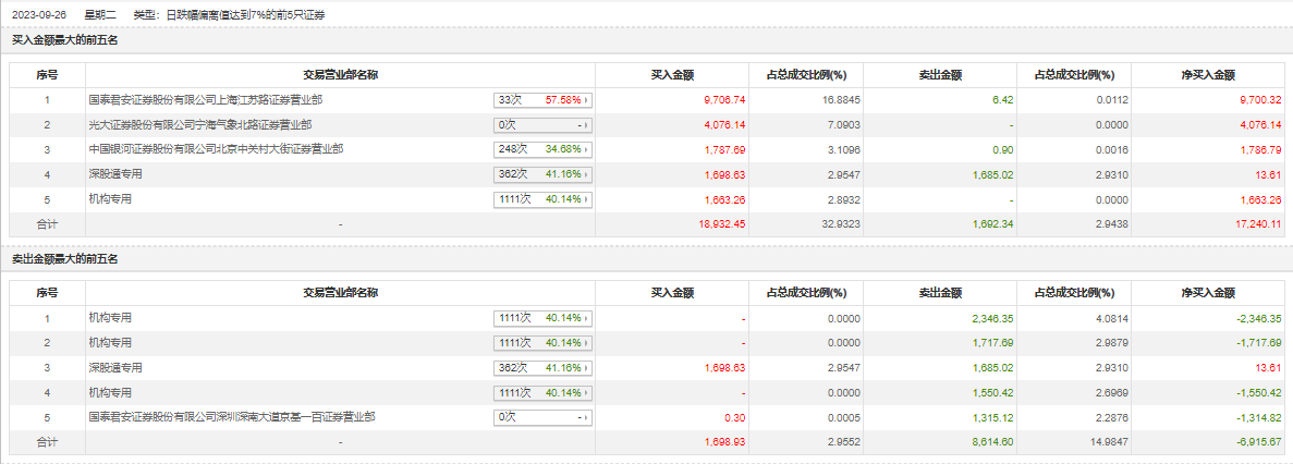 此外,深股通专用、国泰君安证券深圳深南大道京基一百证券营业部分别卖出1685.02万元、1315.12万元;章盟主(国泰君安证券上海江苏路证券营业部)、光大证券宁海气象北路证券营业部分别买入9706.74万元、4076.14万元。