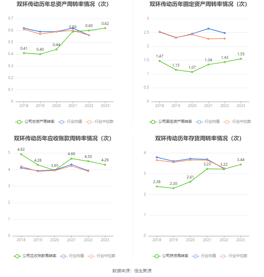 营运能力方面,2023年,公司公司总资产周转率为0.62次,上年同期为0.60次(2022年行业平均值为0.56次,公司位居同行业42/98);固定资产周转率为1.55次,上年同期为1.43次(2022年行业平均值为2.48次,公司位居同行业77/98);公司应收账款周转率、存货周转率分别为4.29次、3.44次。