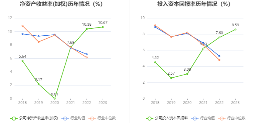 数据显示,2023年公司加权平均净资产收益率为10.67%,较上年同期增长0.29个百分点;公司2023年投入资本回报率为8.59%,较上年同期增长0.99个百分点。