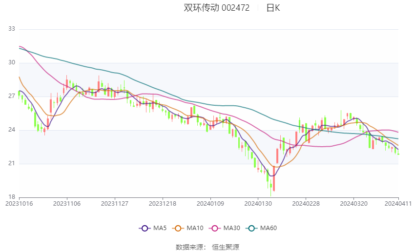 以4月11日收盘价计算,双环传动目前市盈率(TTM)约为22.81倍,市净率(LF)约为2.34倍,市销率(TTM)约为2.31倍。