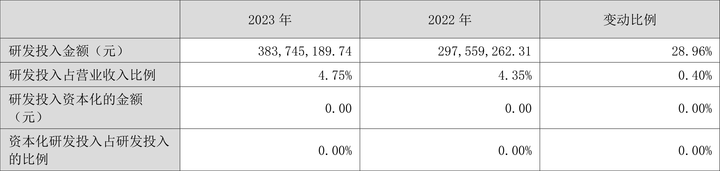 2023年全年,公司研发投入金额为3.84亿元,同比增长28.96%;研发投入占营业收入比例为4.75%,相比上年同期上升0.40个百分点。此外,公司全年研发投入资本化率为0。