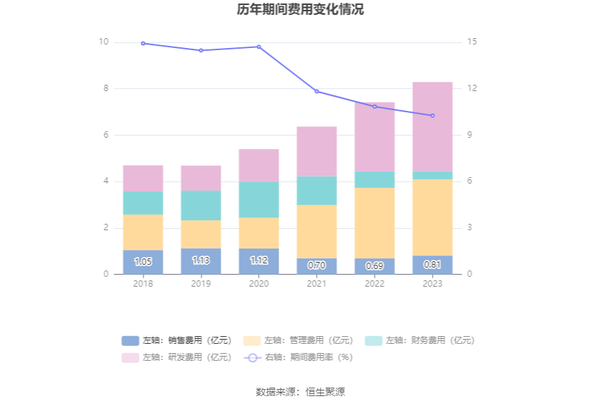 2023年,公司期间费用为8.29亿元,较上年同期增加8756.09万元;但期间费用率为10.27%,较上年同期下降0.58个百分点。其中,销售费用同比增长17.07%,管理费用同比增长8.53%,研发费用同比增长28.96%,财务费用同比下降51.02%。