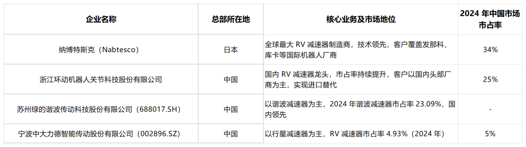 2.中国:环动科技市占率 24.98%(2024 年),位列第二;绿的谐波(谐波减速器为主)、中大力德(行星减速器为主)等为主要参与者。