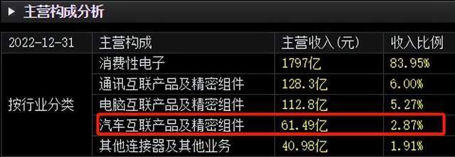 立讯精密预计,“接下来三年(汽车业务)每年会有30%-50%的复合增长”。不过,去年汽车互联产品及精密组件业务占立讯精密的营收比重不到3%,仍然挑不起业绩大梁。