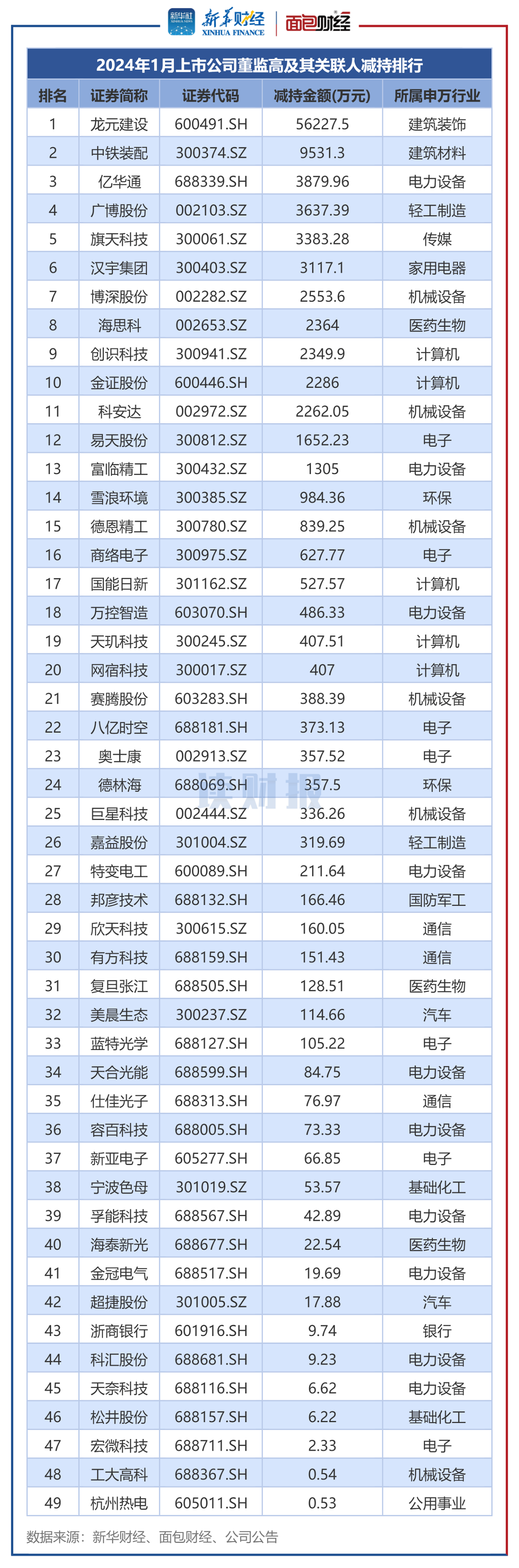 图2:2024年1月董监高及其关联人减持总金额排名前50的公司除此之外,广博股份及旗天科技的减持金额也位居前列。1月,广博股份的董监高合计减持3637.39万元;旗天科技的董监高在1月通过大宗交易的方式合计减持3383.28万元。