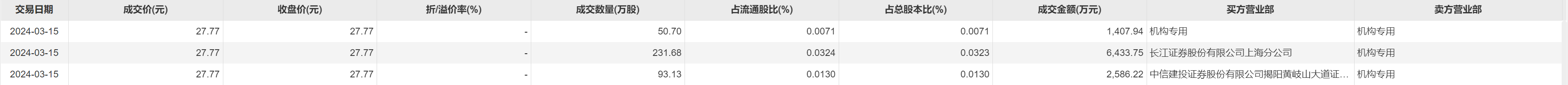 3月15日大宗交易成交375.51万股,成交额1.04亿元,占当日总成交额的6.21%,成交价27.77元,较市场收盘价27.77元持平。