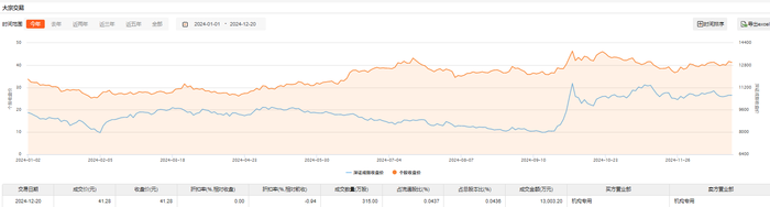 今日大宗交易成交315万股,成交额1.3亿元,占当日总成交额的4.86%,成交价41.28元,较市场收盘价持平。