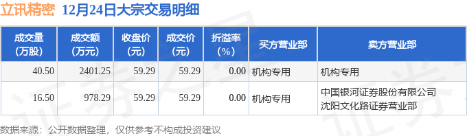 12月24日立讯精密现2笔大宗交易 机构净买入978.29万元