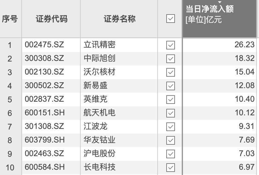 上证报中国证券网讯(记者 李雨琪)Choice数据显示,1月15日,资金净流入额排名前十的个股依次是立讯精密、中际旭创、沃尔核材、新易盛、英维克、航天机电、江波龙、华友钴业、沪电股份、长电科技。其中,立讯精密、中际旭创分别获净流入26.23亿元和18.32亿元。
