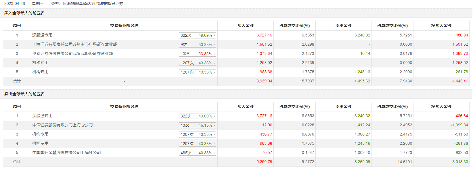 具体来看,机构买入2693.18万元,卖出2613.43万元,合计净买入79.75万元。此外,深股通专用、上海证券苏州中心广场证券营业部分别买入3727.16万元、1601.62万元;深股通专用、中信证券上海分公司分别卖出3240.32万元、1412.24万元。