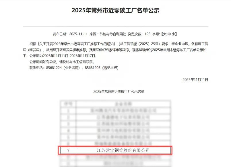 近期,常州市工信局公示2025年度第二批近零碳工厂认证结果,常宝股份凭借在低碳发展、绿色转型方面取得的显著成效顺利通过近零碳工厂认证。