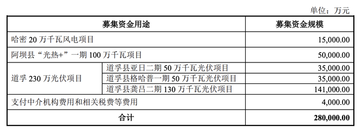 对于募集配套资金安排,草案显示,拟发行股份不超过28亿元用于哈密20万千瓦风电项目、阿坝县“光热+”一期100万千瓦项目、道孚230万光伏项目、及支付中介机构费用和相关税费等费用。