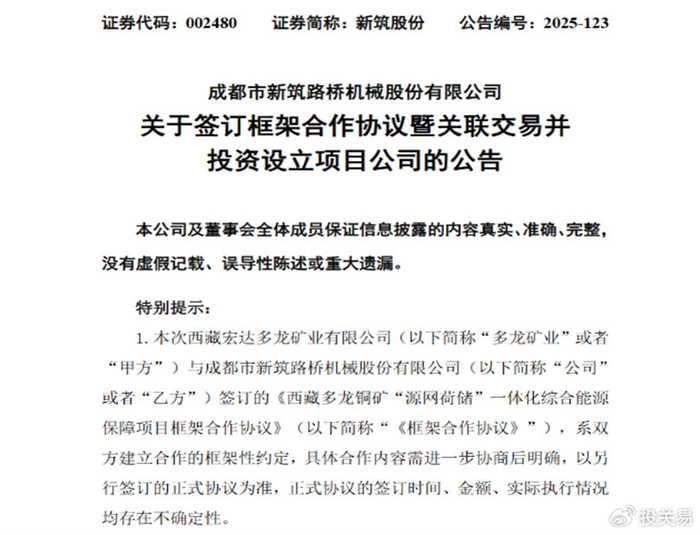 12月22日,成都市新筑路桥机械股份有限公司(证券代码:002480,证券简称:新筑股份)发布重磅公告,公司与西藏宏达多龙矿业有限公司签订《西藏多龙铜矿“源网荷储”一体化综合能源保障项目框架合作协议》,并拟出资5000万元在西藏阿里地区设立全资项目公司,旨在构建“新能源+矿山”协同发展模式,为高海拔地区及矿产开发类项目打造可复制、可推广的商业范本。此举标志着新筑股份在清洁能源产业转型上迈出关键一步,为公司打开全新成长空间注入强劲动力。