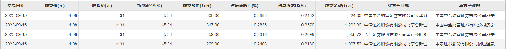9月15日大宗交易成交1145万股,成交额4671.6万元,占当日总成交额的27.52%,成交价4.08元,较市场收盘价4.31元折价5.34%。