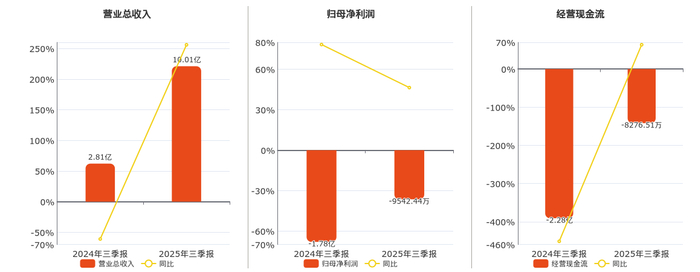 公司营业总收入为10.01亿元,较去年同报告期营业总收入增加7.20亿元,同比较去年同期上涨255.97%。归母净利润为-9542.44万元,较去年同报告期归母净利润增加8270.88万元,实现2年连续上涨。经营活动现金净流入为-8276.51万元,较去年同报告期经营活动现金净流入增加1.45亿元。