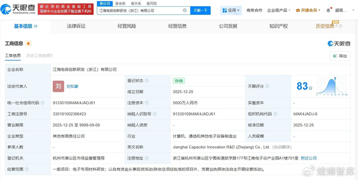天眼查App显示,近日,江海电容创新研发(浙江)有限公司成立,法定代表人为刘知豪,注册资本5000万人民币,经营范围包括电子专用材料研发、以自有资金从事投资活动。股东信息显示,该公司由江海股份(002484)、浙江省交通集团技术研究总院有限责任公司、浙江省经济建设投资有限公司共同持股。