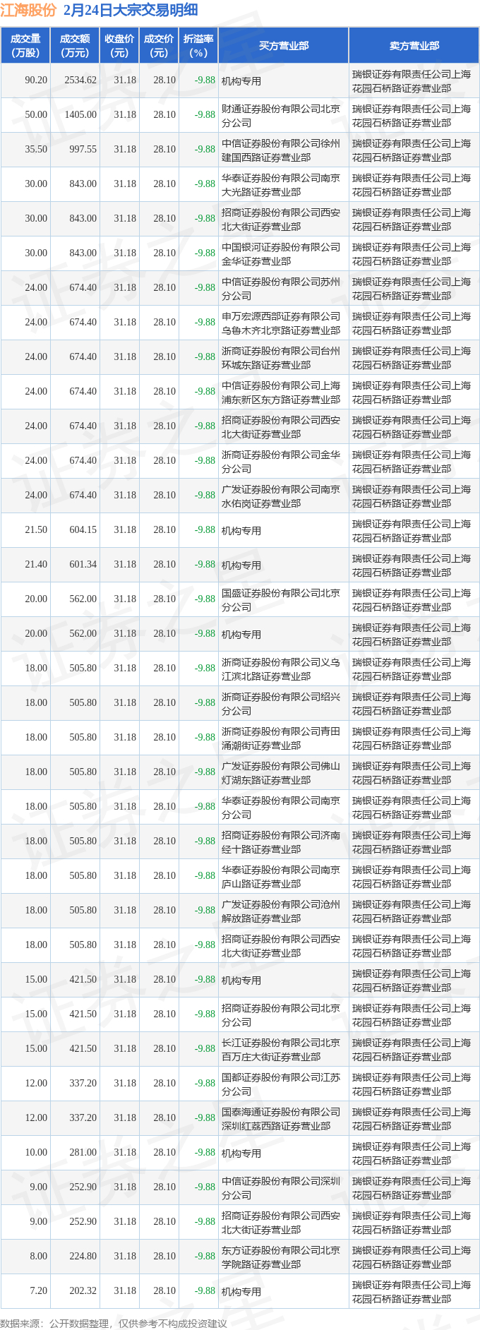 2月24日江海股份现36笔大宗交易 机构净买入5206.93万元