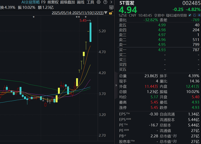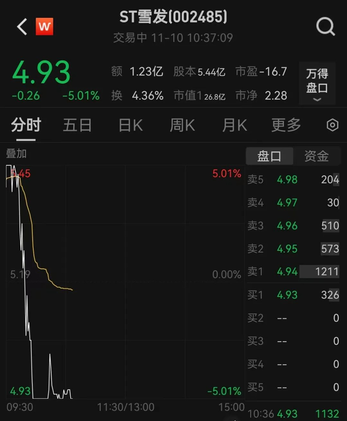 11月10日,ST雪发高开,随后股价直线拉升涨停,盘中闪崩跌停,上演“天地板”,截至发稿,成交额超1亿元。