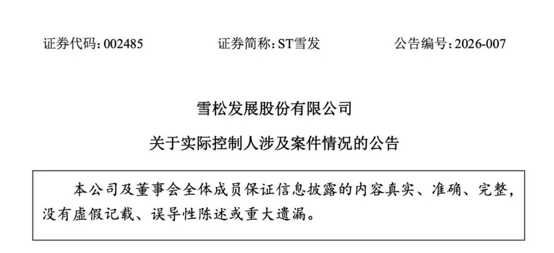 2月10日,雪松发展股份有限公司(以下简称“ST雪发”或“雪松发展”)发布《雪松发展股份有限公司关于实际控制人涉及案件情况的公告》(以下简称《公告》)。《公告》显示,广州市中级人民法院(以下简称“广州中院”)已于2026年2月10日在广州中院第二法庭公开宣判,雪松发展关联方雪松控股集团有限公司、实际控制人张劲等人集资诈骗、非法吸收公众存款、背信运用受托财产、妨害作证一案。