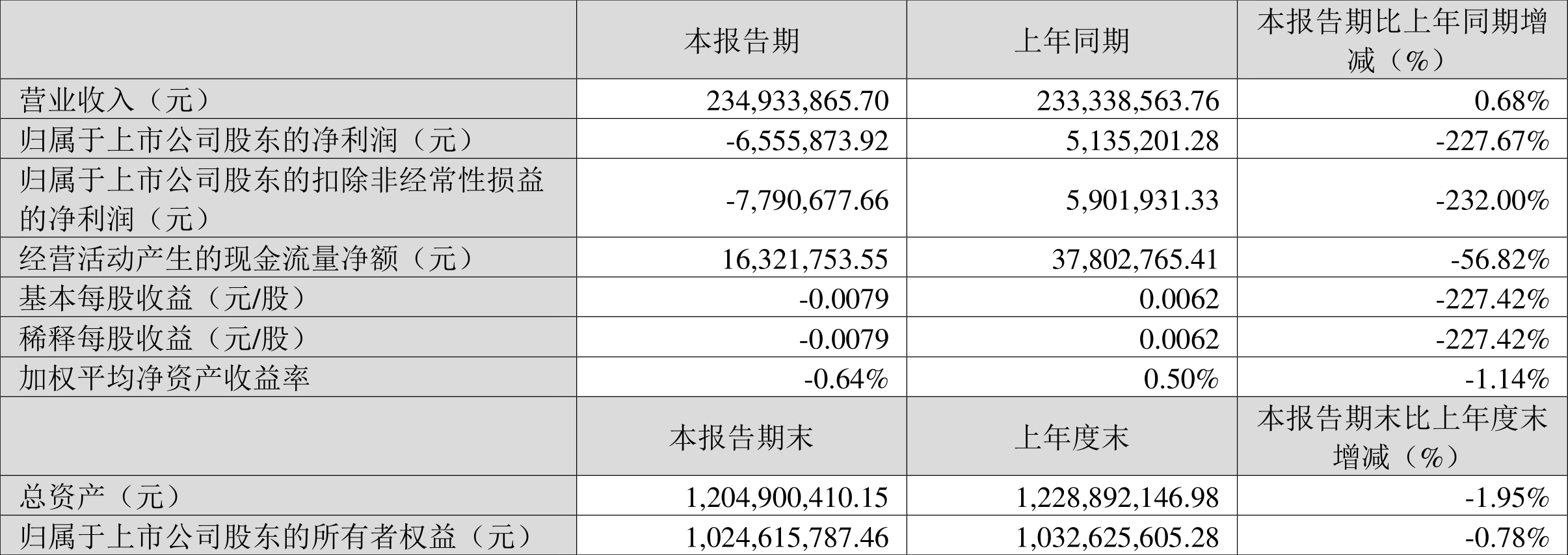 中证智能财讯 嘉麟杰(002486)4月27日披露2024年一季报。2024年第一季度,公司实现营业总收入2.35亿元,同比增长0.68%;归母净利润亏损655.59万元,上年同期盈利513.52万元;扣非净利润亏损779.07万元,上年同期盈利590.19万元;经营活动产生的现金流量净额为1632.18万元,同比下降56.82%;报告期内,嘉麟杰基本每股收益为-0.0079元,加权平均净资产收益率为-0.64%。