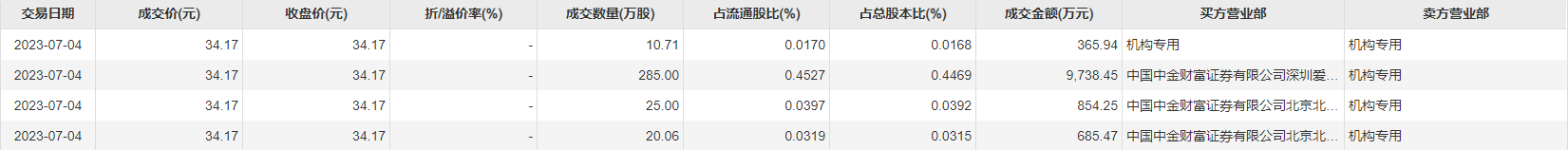 7月4日大宗交易成交340.77万股,成交额1.16亿元,占当日总成交额的5.73%,成交价34.17元,较市场收盘价34.17元持平。