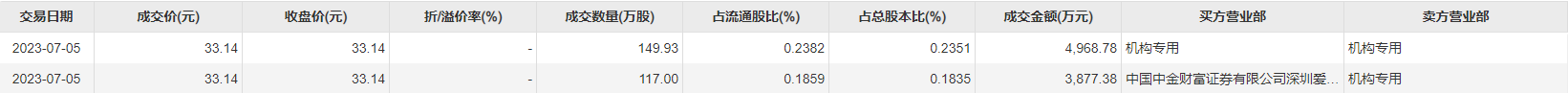 7月5日大宗交易成交266.93万股,成交额8846.16万元,占当日总成交额的8.03%,成交价33.14元,较市场收盘价33.14元持平。