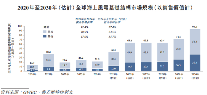 根据弗若斯特沙利文(Frost & Sullivan)报告,以销售价值计,全球海上风电基础结构市场从2020年的人民币137亿元稳步攀升至2024年的人民币219亿元,年复合增长率达12.4%。随着各国加速推进能源转型和海上风电项目落地,预计2024年至2030年市场将进入高速扩张期,年复合增长率大幅提升至27.4%,按此增速测算,到2030年,全球海上风电基础结构市场规模有望达到人民币938亿元,较2024年增长约4倍。