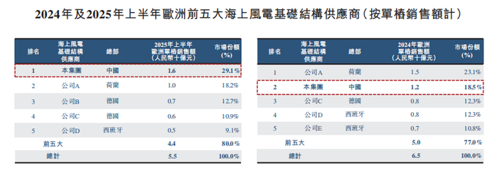 根据弗若斯特沙利文(Frost & Sullivan)报告,以2025年上半年单桩销售金额计,公司是欧洲市场排名第一的海上风电基础装备供应商,市场份额2024年的18.5%增长至2025年上半年的29.1%。根据同一数据来源,截至2025年6月30日,公司是亚太地区唯一实现向欧洲批量交付单桩的供应商。
