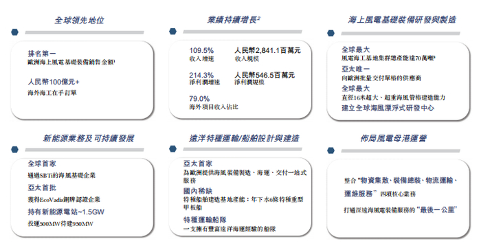 公司是一家全球领先的海上风电核心装备供应商,为全球大型海上风电开发商提供风电基础装备「建造+运输+交付」一站式解决方案。