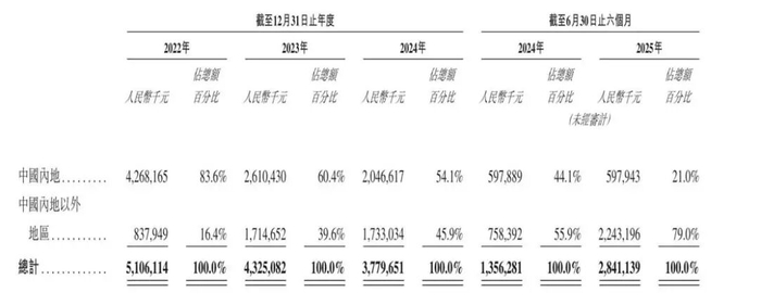 2025年上半年,大金重工的前五大客户中,前四大客户均为国外客户。这4名国外客户就为其贡献了69.2%的收入。上图所示,期内大金重工来自境外的收入占比为79%。