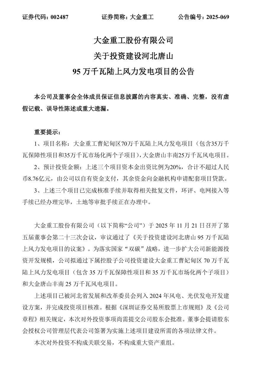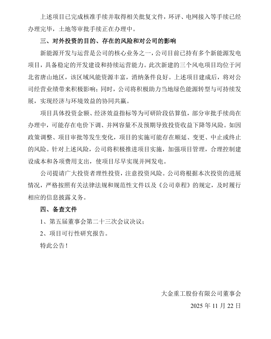 2025年11月21日,大金重工召开了第五届董事会第二十三次会议审议,通过了《关于投资建设河北唐山95万千瓦陆上风力发电项目的议案》。