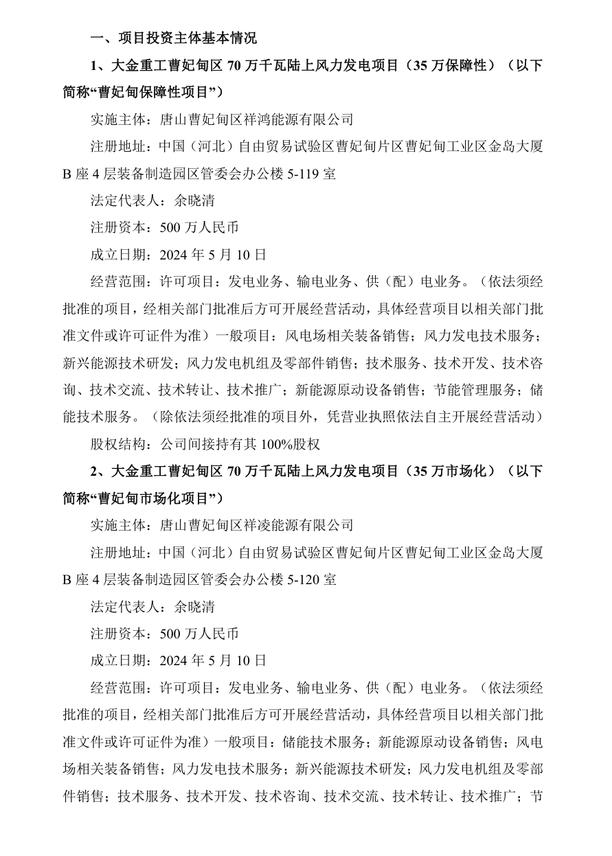根据公告,为落实国家“双碳”战略,进一步扩大公司新能源投资开发规模,大金重工拟通过下属控股子公司投资建设大金重工曹妃甸区70万千瓦陆上风力发电项目(包含35万千瓦保障性项目和35万千瓦市场化两个子项目) 和大金唐山丰南25万千瓦风电项目。上述项目已被河北省发展和改革委员会列入2024年风电、光伏发电开发建设方案,并完成投资项目核准。