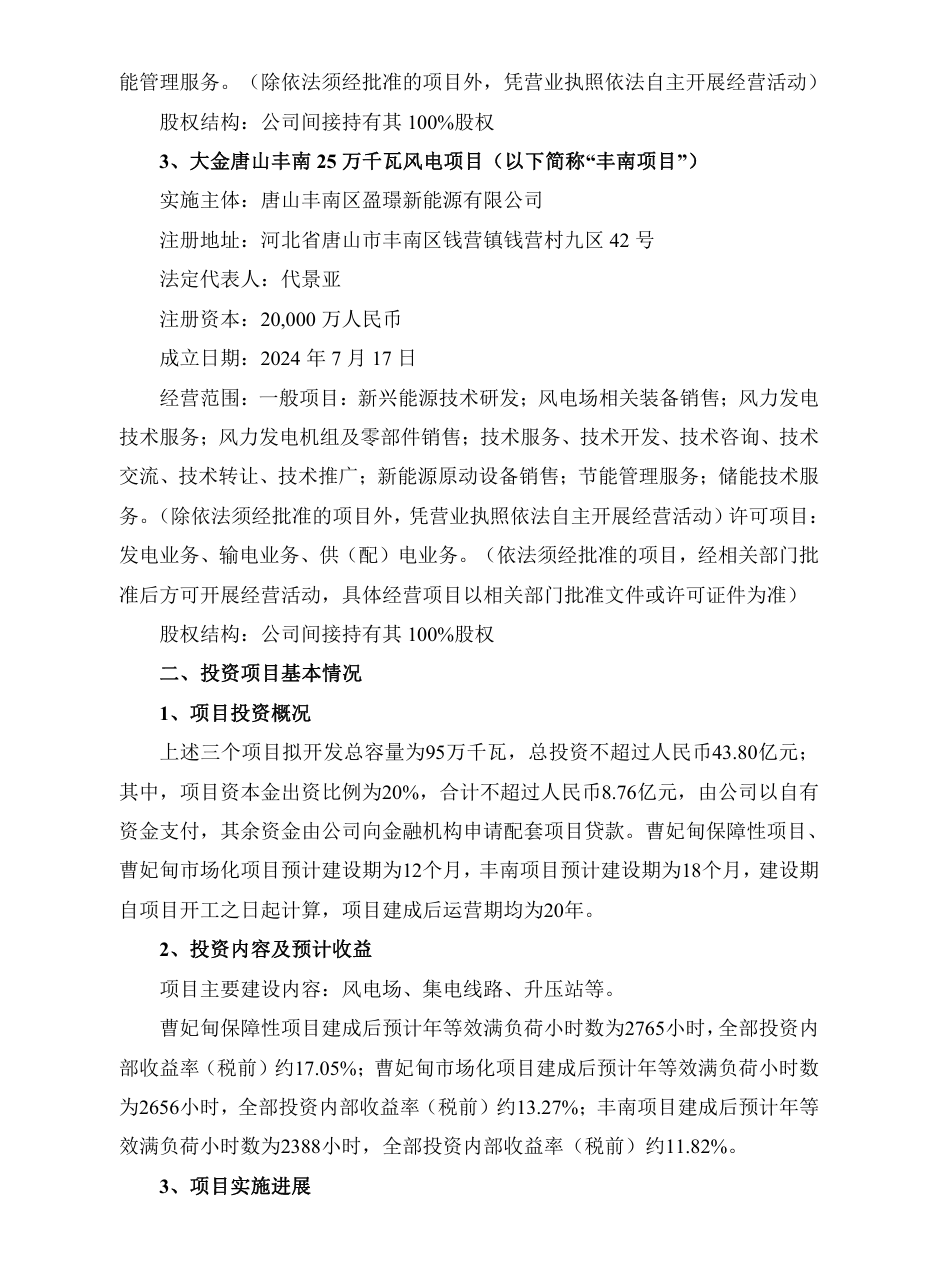 三个项目拟开发总容量为95万千瓦,总投资不超过43.80亿元。曹妃甸保障性项目、曹妃甸市场化项目预计建设期为12个月,丰南项目预计建设期为18个月,建设期自项目开工之日起计算,项目建成后运营期均为20年。