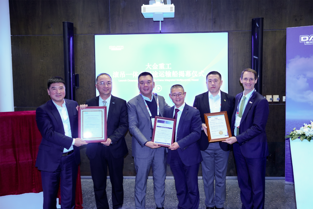 首发仪式上,DNV、ABS 、BV 分别代表各自机构,向大金重工颁发 AIP 原则性认可证书。这一认证是国际权威机构对该船型设计符合全球安全、环保与合规标准的直接背书。三大船级社的联合认证,不仅印证了该船型的技术先进性与可靠性,也为其全球市场推广奠定了坚实基础。