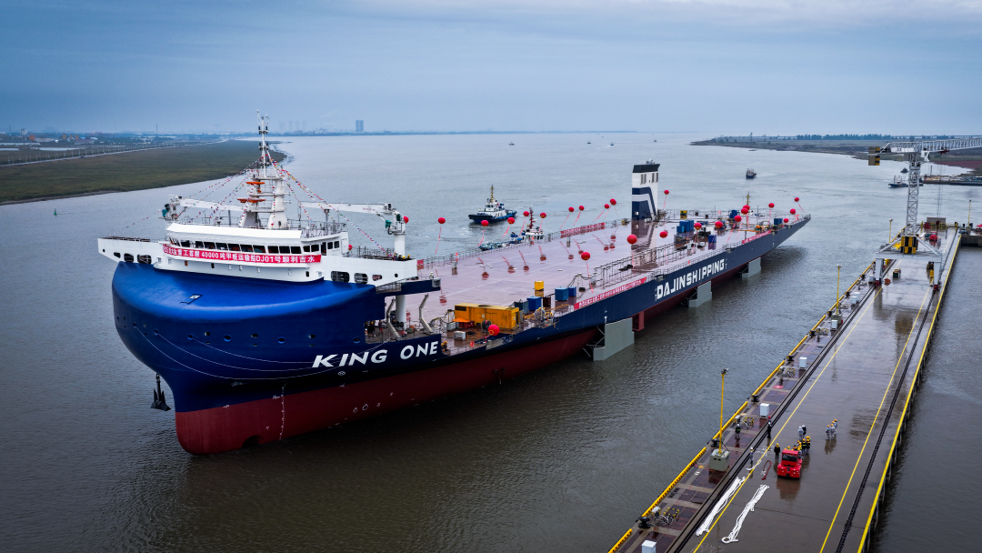 目前,大金盘锦造船基地有四条在建船,并在今年10月密集实现“一船成功吉水,一船船台收尾,一船船台总装,一船点火开工”的四连突破。其中,KING ONE号作为代表性甲板运输船,顺利下水,达成关键里程碑;KING TWO号基本完成船台搭载,进入下水前最后准备阶段;KING THREE号正式登上船台,全面开启船体结构建造;EMPERORONE号同步开工建设。