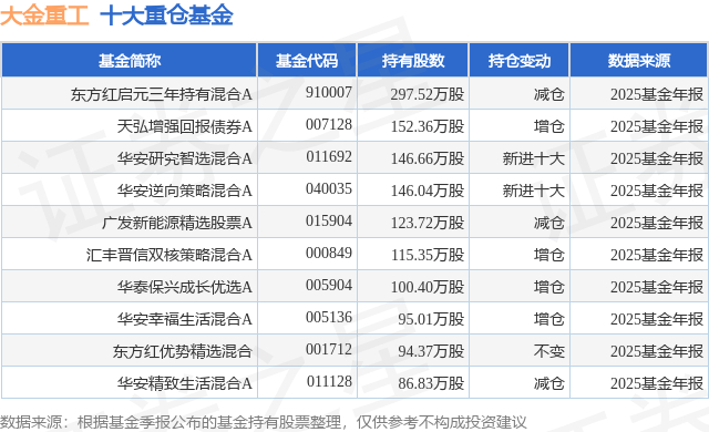 重仓大金重工的前十大公募基金请见下表: