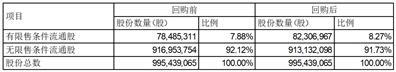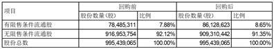 注:以上数据仅为根据回购金额上下限和回购价格上限测算的结果,变动情况暂未考虑其他因素影响,具体回购股份数量及占总股本比例以回购期满时实际回购数量为准。本次回购前后各类股票占总股本比例尾数变动与相应增减变动股数占总股本比例的尾数之差异,系四舍五入所致。