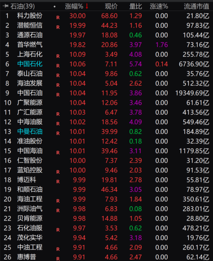 3月2日午后,A股油气股再度走强,整个板块几乎全线涨停,中国石油、中国石化罕见涨停,科力股份30%涨停,潜能恒信、通源石油20%涨停,中国海油、科力股份、新锦动力、贝肯能源等近30股涨停。