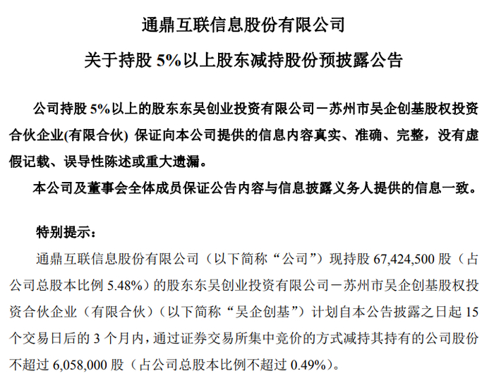 11月25日,通鼎互联(002491.SZ)公告,公司股东东吴创业投资有限公司-苏州市吴企创基股权投资合伙企业(有限合伙)(简称“吴企创基”)计划自本公告披露之日起15个交易日后的3个月内,通过证券交易所集中竞价的方式减持其持有的公司股份不超过605.8万股(占公司总股本比例不超过0.49%)。