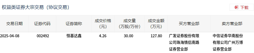 恒基达鑫今日大宗交易折价成交30万股,成交额127.8万元