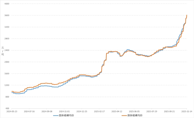 2024年以来,硫磺价格呈现明显的上涨趋势,在2025年11月达到高峰,成为市场备受关注的焦点。2025年11月14日,国内99.5%硫磺华东地区到岸价报3860元/吨,月环比上涨43%,同比上涨166%。外盘合约价格也持续走高,部分中东12月船货成交价已对应到岸成本超4000元/吨,对国内价格形成强支撑。这一波硫磺价格的大幅上涨,背后是供给端的持续收缩、低库存以及新能源需求爆发等多重因素的共同作用。