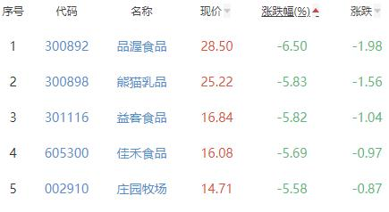 品渥食品、熊猫乳品、益客食品、佳禾食品、庄园牧场位列涨幅榜后五位,涨幅分别为-6.50%、-5.83%、-5.82%、-5.69%和-5.58%。