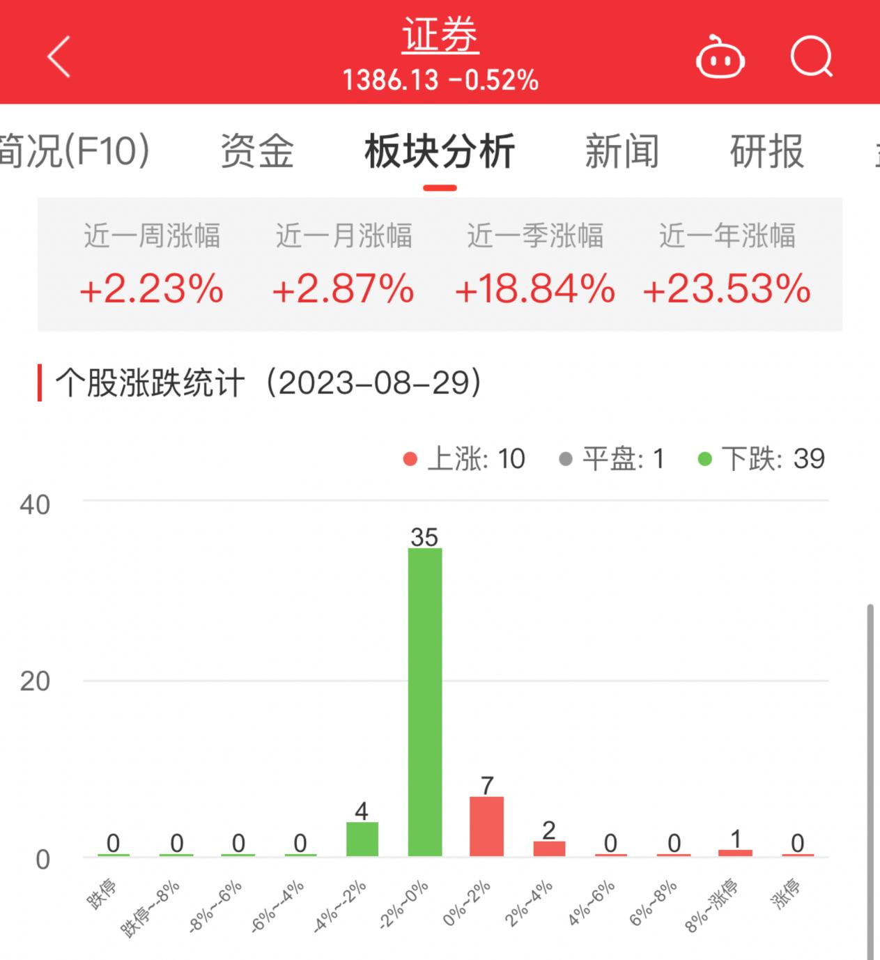 中国经济网北京8月29日讯 今日,证券板块整体跌幅0.52%,其中10只股票上涨,1只股票平盘,39只股票下跌。