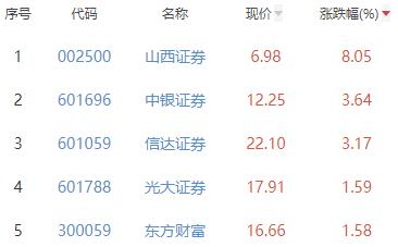 其中,山西证券、中银证券、信达证券、光大证券、东方财富位列板块涨幅前五位,涨幅分别为8.05%、3.64%、3.17%、1.59%、1.58%。