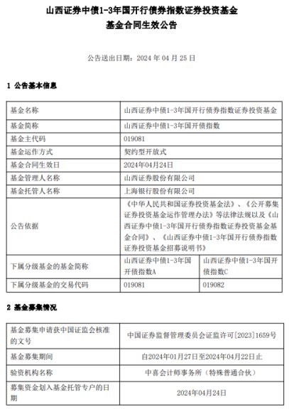 中国经济网北京4月25日讯今日,山西证券股份有限公司发布山西证券中债1-3年国开行债券指数证券投资基金基金合同生效公告。