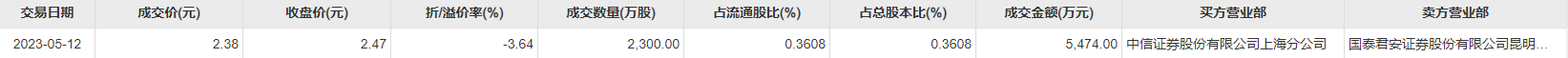 5月12日大宗交易成交2300万股,成交额5474万元,占当日总成交额的43.42%,成交价2.38元,较市场收盘价2.47元折价3.64%。