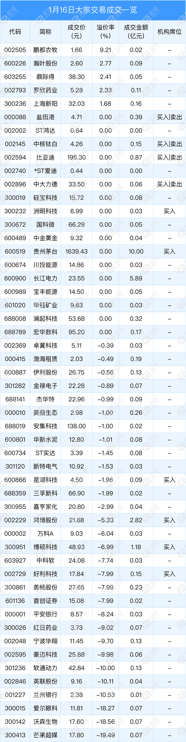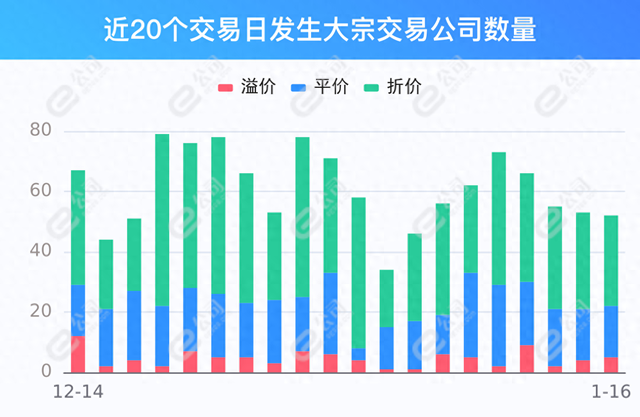 根据沪深交易所最近公布,两市1月16日共52只个股出现大宗交易,成交额为24.85亿元。其中溢价成交5只,平价成交17只,折价成交30只。