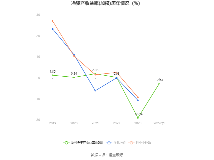 数据显示,2024年第一季度公司加权平均净资产收益率为-2.63%,较上年同期下降1.88个百分点;公司2024年第一季度投入资本回报率为-1.84%,较上年同期下降3.61个百分点。