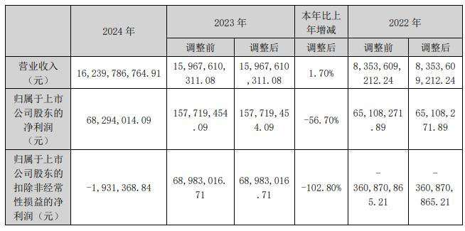 2024年,协鑫集成实现营业收入162.40亿元,同比增长1.70%;归属于上市公司股东的净利润6829.40万元,同比下降56.70%;归属于上市公司股东的扣除非经常性损益的净利润-193.14万元,上年同期为6898.30万元。